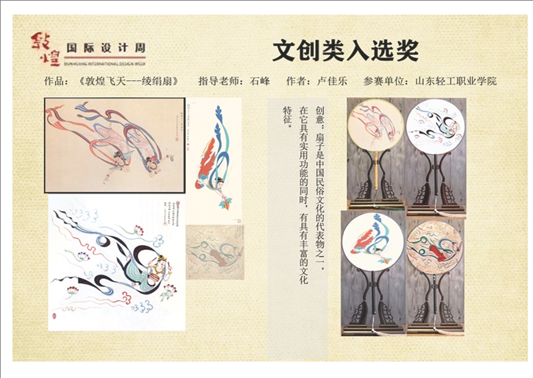 2019年11月 18 日,第二届敦煌国际设计周设计大赛颁奖典礼在甘肃省敦煌市举行。我校艺术设计系石峰老师指导的创美设计工作室的卢佳乐和张凯月同学创作的敦煌文化创意类产品“敦煌飞天--绫绢扇”和“敦煌鼠标垫”获得入围奖,是省内唯一获得入围奖的专科院校。